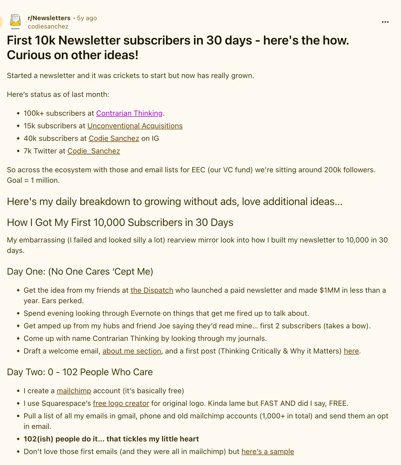 We posted the full day-by-day breakdown on Reddit 5 years ago if you want the details. It's dated, but the bones still hold. It tells you exactly how we got to 10k subscribers in 30 days.